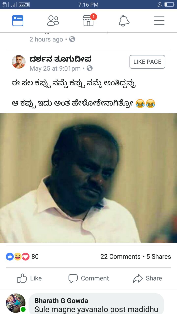 ಈ ಸಲ ಕಪ್ ನಮ್ದೇ ಅಂತ ಅಂತಿದ್ದವ್ರು ಹೇಳುತ್ತಿದ್ದವ್ರು ಆ ಕಪ್ಪು ಇದೇ ಅಂತ ಹೇಳೋಕೇನಾಗಿತ್ತೋ ಎಂದು ಸಿಎಂ ಕುಮಾರಸ್ವಾಮಿ ಅವರ ಕಪ್ಪು ಬಣ್ಣದ ಚಿತ್ರ ಪೋಸ್ಟ್ ಹಾಕಿ ಅಣಕಿಸಿದ್ದಾರೆ.