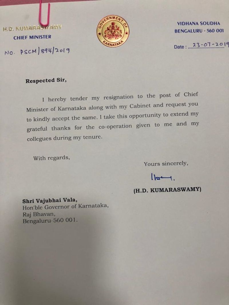 ಬಹುಮತ ಸಾಬೀತು ಪಡಿಸಲು ವಿಫಲರಾದ ಕೆಲವೇ ಕ್ಷಣಗಳಲ್ಲಿ, ರಾಜಭವನಕ್ಕೆ ತೆರಳಿದ ಎಚ್.ಡಿ. ಕುಮಾರಸ್ವಾಮಿ ರಾಜ್ಯಪಾಲ ವಾಜುಭಾಯಿ ವಾಲಾರನ್ನು ಭೇಟಿಯಾಗಿ ರಾಜೀನಾಮೆ ಸಲ್ಲಿಸಿದ್ದಾರೆ.