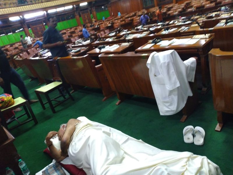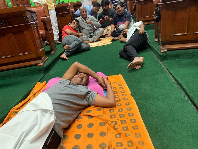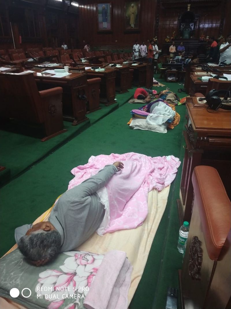 ವಿಶ್ವಾಸಮತ ಸಾಬೀತಿಗೆ ರಾಜ್ಯಪಾಲರು ಶುಕ್ರವಾರ ಮಧ್ಯಾಹ್ನ 1.30ರವರೆಗೆ ಅವಕಾಶ ನೀಡಿದ್ದಾರೆ. ಸದನವನ್ನು ಶುಕ್ರವಾರಕ್ಕೆ ಮುಂದೂಡಿದ ನಂತರ ಬಿಜೆಪಿ ಶಾಸಕರು ಮಾತ್ರ ವಿಧಾನಸಭೆ ಬಿಟ್ಟು ಹೊರಗೆ ಹೋಗಿಲ್ಲ. ಗುರುವಾರ ರಾತ್ರಿಯನ್ನು ಬಿಜೆಪಿ ಶಾಸಕರು ವಿಧಾನಸೌಧದಲ್ಲೇ ಕಳೆದಿದ್ದಾರೆ. ಅಲ್ಲಿಯೇ ಚಾಪೆ ದಿಂಬು ಹಾಕಿಕೊಂಡು ನಿದ್ರಿಸಿದ್ದಾರೆ.