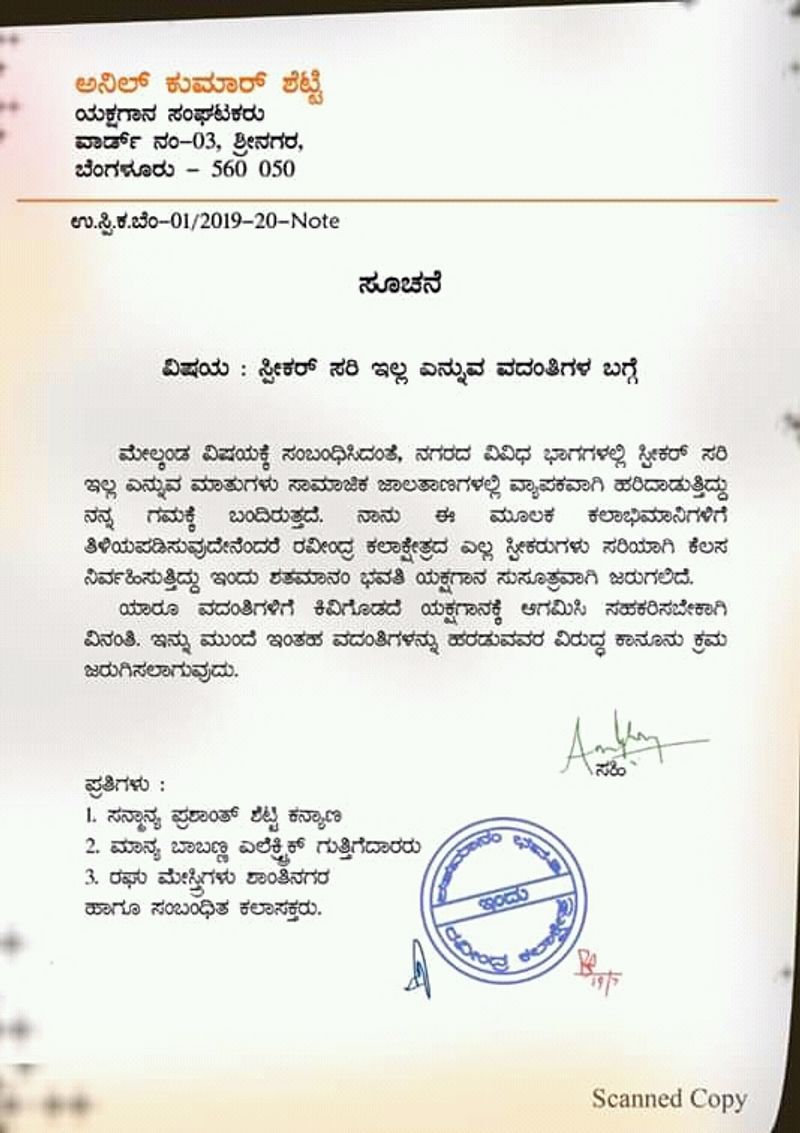 ಇಂತಹ ಟ್ವೀಟ್ ವೈರಲ್ ಆಗುತ್ತಿದ್ದ ಬೆನ್ನಲ್ಲೇ ಯಕ್ಷಗಾನ ಸಂಘಟಕ ಅನಿಲ್ ಕುಮಾರ್ ಶೆಟ್ಟಿ ಪ್ರಕಟಣೆಯೊಂದನ್ನು ಹೊರಡಿಸಿ 'ರವೀಂದ್ರ ಕಲಾಕ್ಷೇತ್ರದ ಎಲ್ಲಾ ಸ್ಪೀಕರ್ಗಳು ಸರಿಯಾಗಿ ಕೆಲಸ ನಿರ್ವಹಿಸುತ್ತಿವೆ,. ವದಂತಿಗಳಿಗೆ ಕಿಡಿಗೊಡಬೇಡಿ. ಇಂದಿನ ಕಾರ್ಯಕ್ರಮ ಸುಸೂತ್ರವಾಗಿ ಜರುಗಲಿದೆ' ಎಂದೂ ಸ್ಪಷ್ಣನೆ ನೀಡಿದ್ದಾರೆ.