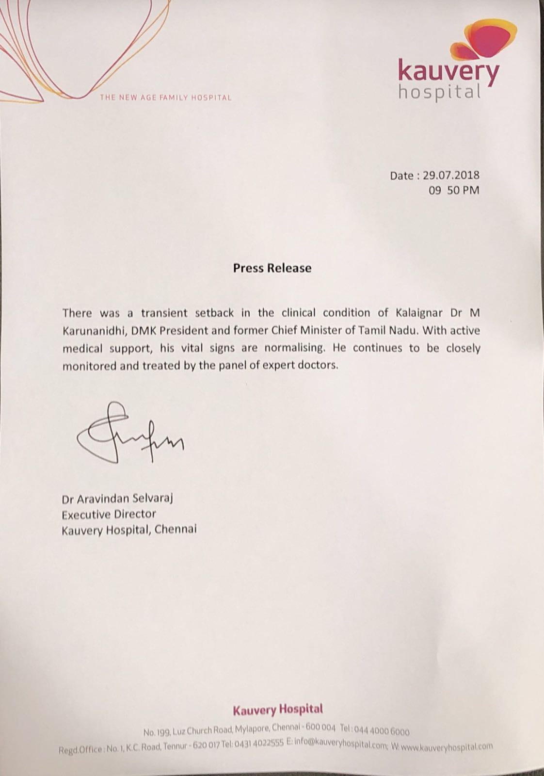 ಕರುಣಾನಿಧಿ ಆರೋಗ್ಯದಲ್ಲಿ ಏರುಪೇರುಮತ್ತಷ್ಟು ಹದಗೆಟ್ಟ ಕರುಣಾನಿಧಿ ಆರೋಗ್ಯಚೆನ್ನೈನ ಕಾವೇರಿ ಆಸ್ಪತ್ರೆಯಲ್ಲಿ ಚಿಕಿತ್ಸೆಕೆಲವೇ ಕ್ಷಣಗಳಲ್ಲಿ ವೈದ್ಯರಿಂದ ಸುದ್ದಿಗೋಷ್ಠಿಚೆನ್ನೈ ನಗರಕ್ಕೆ ಹೆಚ್ಚಿನ ಪೊಲೀಸ್ ಭದ್ರತೆ