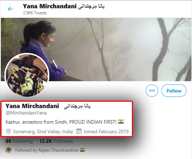 ಈ ಯುವತಿಯ ಹೆಸರು ಸುಹಾನಿ ಯಾನಾ ಮೀರ್ ಚಂದಾನಿ. ಆದರೆ ಈಕೆ ತನ್ನನ್ನು ತಾನು ಯಾನಾ ಮೀರ್ ಚಂದಾನಿ ಎಂದು ಕರೆಸಿಕೊಳ್ಳುತ್ತಾಳೆ. ಈಕೆಯ ಟ್ವಿಟರ್ ಅಕೌಂಟ್ ಪರಿಶೀಲಿಸಿದಾಗ ಈಕೆ ಕಾಶ್ಮೀರದ ಸೋನ್ಮಾರ್ಗ್ ಪ್ರದೇಶದವಳಾಗಿದ್ದು, ಈಕೆಯ ಕುಟುಂಬ ಮೂಲತಃ ಪ್ರಸ್ತುತ ಪಾಕಿಸ್ತಾನದಲ್ಲಿರುವ ಸಿಂಧ್ ಪ್ರದೇಶದವರೆಂದು ತಿಳಿದು ಬಂದಿದೆ. ಅಲ್ಲದೇ ಸದ್ಯಕ್ಕೀಗ ಮುಂಬೈನಲ್ಲಿರುವ ಮೀರ್ ಚಂದಾನಿ ಹಾಂಗ್ ಕಾಂಗ್ ಮೂಲದ ಕಂಪೆನಿಯಲ್ಲಿ ಉದ್ಯೋಗದಲ್ಲಿದ್ದರೆಂಬುವುದು ಬಯಲಾಗಿದೆ. ಇದಕ್ಕೂ ಮುನ್ನ ಈಕೆ ವಿದೆಶೀ ಏರ್ಲೈನ್ಸ್ನಲ್ಲಿ ಗಗನಸಖಿಯಾಗಿ ಕಾರ್ಯ ನಿರ್ವಹಿಸುತ್ತಿದ್ದರು.
