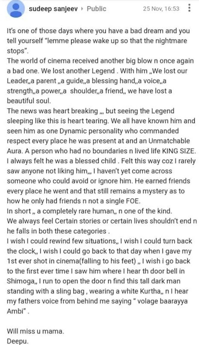 ಸಿನಿಲೋಕಕ್ಕೆ ಇಂದು ಮತ್ತೊಂದು ಬರಸಿಡಿಲು ಬಂದೆರಗಿದೆ, ಆದರೆ ಈ ಬಾರಿಯಾದ ನಷ್ಟ ಬಹಳ ದೊಡ್ಡದು. ನಾವಿಂದು ಮತ್ತೊಬ್ಬ ದಿಗ್ಗಜನನ್ನು ಕಳೆದುಕೊಂಡೆವು. ನಾವಿಂದು ನಮ್ಮ ನಾಯಕ, ತಂದೆ, ಮಾರ್ಗದರ್ಶಕ, ಆಶೀರ್ವಾದ ನೀಡುತ್ತಿದ್ದ ಕೈಗಳು, ನಮ್ಮ ಪರವಾದ ಧ್ವನಿ, ಒಂದು ಅಪೂರ್ವ ಶಕ್ತಿ, ಬಲ, ನೋವಿಗೆ ಹೆಗಲಾಗುತ್ತಿದ್ದ ಜೀವ, ಓರ್ವ ಅತ್ಯುತ್ತಮ ಗೆಳೆಯ ಒಟ್ಟಾಗಿ ಓರ್ವ ಅದ್ಭುತ ವ್ಯಕ್ತಿತ್ವವುಳ್ಳ ದಿಗ್ಗಜನನ್ನು ಕಳೆದುಕೊಂಡು ಅನಾಥರಾಗಿದ್ದೇವೆ.