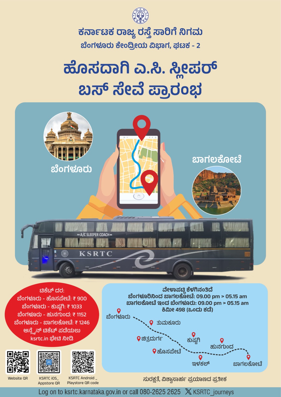 ಕರ್ನಾಟಕ ರಾಜ್ಯ ರಸ್ತೆ ಸಾರಿಗೆ ನಿಗಮವು (KSRTC) ಬೆಂಗಳೂರು ಮತ್ತು ಬಾಗಲಕೋಟೆ ನಡುವೆ ಹೊಸ ಎ.ಸಿ. ಸ್ಲೀಪರ್ ಕೋಚ್ ಬಸ್ ಸೇವೆಯನ್ನು ಪ್ರಾರಂಭಿಸಿದೆ. ರಾತ್ರಿ ವೇಳೆಯಲ್ಲಿ ಸಂಚರಿಸುವ ಈ ಐಷಾರಾಮಿ ಬಸ್ನ ಟಿಕೆಟ್ ದರ, ವೇಳಾಪಟ್ಟಿ ಮತ್ತು ಆನ್ಲೈನ್ ಬುಕಿಂಗ್ ವಿವರಗಳನ್ನು ಇಲ್ಲಿ ನೀಡಲಾಗಿದೆ.