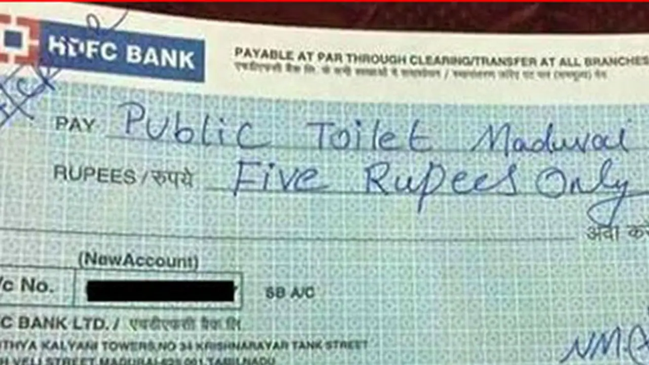 ಮಧುರೈ ಪಟ್ಟಣದಲ್ಲಿ ಸಾರ್ವಜನಿಕ ಶೌಚಾಲಯ ಬಳಸಿದ ಭೂಪನೊಬ್ಬ ಚಿಲ್ಲರೆ ಇಲ್ಲದ ಕಾರಣ 5 ರೂ.ಗಳ ಚೆಕ್ ನೀಡಿದ್ದಾನೆ. ಈತ ನೀಡಿರುವ ಆ ಚೆಕ್ ಸಾಮಾಜಿಕ ಜಾಲ ತಾಣಗಳಲ್ಲಿ ವೈರಲ್ ಆಗಿ ಚರ್ಚೆಗೆ ಕಾರಣವಾಗಿದೆ.