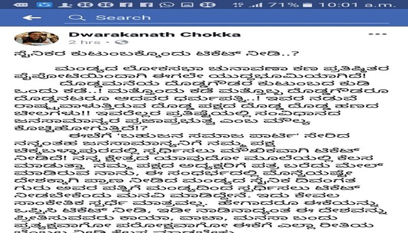 ಈ ಕುರಿತು ಬಿಎಸ್ ಪಿ ರಾಜ್ಯಾಧ್ಯಕ್ಷರಿಗೆ ಪತ್ರ ಬರೆದಿರುವ ದ್ವಾರಕಾನಾಥ್, ಮಂಡ್ಯದಲ್ಲಿ ಹಣಬಲ, ತೋಳ್ಬಲದ ರಾಜಕೀಯ ನಡೆಯುತ್ತಿದ್ದು, ಇದಕ್ಕೆ ಪರ್ಯಾಯವಾಗಿ ಜನತಾ ರಾಜಕೀಯಕ್ಕೆ ನಾಂದಿ ಹಾಡಲು ಹುತಾತ್ಮ ಯೋಧ ಗುರುವಿನ ಪತ್ನಿಗೆ ಟಿಕೆಟ್ ನೀಡಬೇಕು ಎಂದು ದ್ವಾರಕಾನಾಥ್ ಆಗ್ರಹಿಸಿದ್ದಾರೆ.