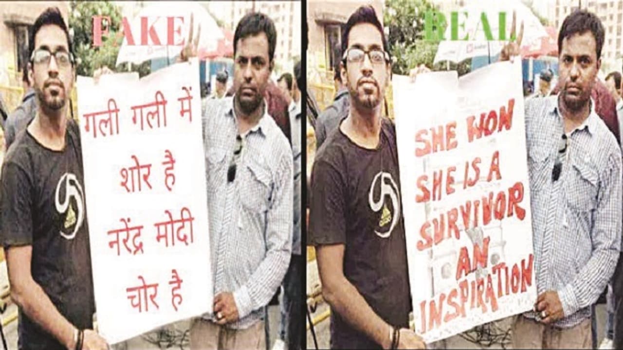 ಮೂಲ ಫೋಟೋದಲ್ಲಿ ಯುವಕರು ಹಿಡಿದುಕೊಂಡಿದ್ದ ಫಲಕದಲ್ಲಿ ‘ಶಿ ವನ್, ಶಿ ಈಸ್ ಸರ್ವೈವರ್ ಆ್ಯನ್ ಇನ್ಸ್ಪಿರೇಶನ್’ ಎಂದು ಬರೆಯಲಾ ಗಿತ್ತು. ಗೂಗಲ್ ರಿವರ್ಸ್ ಇಮೇಜ್ನಲ್ಲಿ ಇನ್ನಷ್ಟು ಪರಿಶೀಲಿಸಿದಾಗ