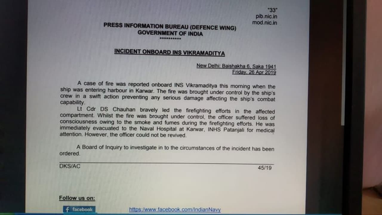 ಕಾರವಾರದ ಬಂದರಿನಲ್ಲಿದ್ದ ಯುದ್ಧನೌಕೆ INS ವಿಕ್ರಮಾದಿತ್ಯದಲ್ಲಿ ಇಂದು ಶುಕ್ರವಾರ ಬೆಳಗ್ಗೆ ಇದ್ದಕ್ಕಿದ್ದಂತೆ ಬೆಂಕಿ ಕಾಣಿಸಿಕೊಂಡಿತ್ತು. ಇದನ್ನು ನಂದಿಸುತ್ತಿದ್ದ ತಂಡದ ನೇತೃತ್ವ ವಹಿಸಿಕೊಂಡಿದ್ದ ನೌಕಾಧಿಕಾರಿ ಡಿಎಸ್ ಚೌಹಾಣ್ ನೌಕೆಯಲ್ಲಿ ಹಬ್ಬಿಕೊಂಡಿದ್ದ ದಟ್ಟ ಹೊಗೆಯಿಂದಾಗಿ ಪ್ರಜ್ಞೆ ತಪ್ಪಿ ಬಿದ್ದಿದ್ದರು. ಕೂಡಲೇ ಅವರನ್ನು ನಗರದ ನೌಕಾಸ್ಪತ್ರೆಗೆ ದಾಖಲಿಸಲಾಯಿತಾದರೂ ಬದುಕುಳಿಯಲಿಲ್ಲ ಎಂದು ನೌಕಾದಳದ ಅಧಿಕಾರಿಗಳು ತಿಳಿಸಿದ್ದಾರೆ.