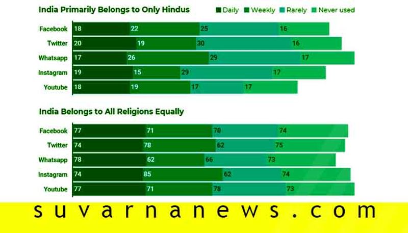 ಮಂಗಳವಾರದಂದು ಬಹಿರಂಗವಾದ CSDS ವರದಿಯನ್ವಯ ಸೋಶಿಯಲ್ ಮೀಡಿಯಾ ಬಳಕೆದಾರರಲ್ಲಿ ಶೇ. 19ರಷ್ಟು ಮಂದಿ ಮಾತ್ರ ಭಾರತ ಕೇವಲ ಹಿಂದೂಗಳ ರಾಷ್ಟ್ರವೆಂಬ ಅಭಿಪ್ರಾಯ ಹೊಂದಿದ್ದಾರೆ. ಇತ್ತ ಸೋಶಿಯಲ್ ಮೀಡಿಯಾ ಬಳಸದಿರುವ ಶೇ. 17ರಷ್ಟು ಮಂದಿ ಕೂಡಾ ಇದೇ ಅಭಿಪ್ರಾಯ ಹೊಂದಿದ್ದಾರೆ. ಇವರ ಅನ್ವಯ ಭಾರತದಲ್ಲಿ ಹಿಂದೂಗಳ ಪ್ರಭಾವ ಜಾಸ್ತಿ ಇದೆಯಂತೆ.