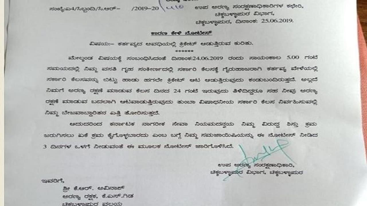 ಕೆಲಸದ ಸಮಯದಲ್ಲಿ ಕ್ರಿಕೆಟ್ ಆಡಿದ ಸರಕಾರಿ ಅಧಿಕಾರಿ ನೋಟಿಸ್ ಗೆ ಉತ್ತರ ನೀಡಬೇಕಾದ ಕಾಲ ಬಂದಿದೆ. ಜೂನ್ 25 ರಂದು ಕಾರಣ ಕೇಳಿ ಫಾರೆಸ್ಟ್ ಆಫೀಸರ್ ಕೆ.ಆರ್.ಅವಿನಾಶ್ ಅವರಿಗೆ ನೋಟಿಸ್ ನೀಡಲಾಗಿದೆ. ಜೂನ್ 24 ರಂದು ಸಾಯಂಕಾಲ 5 ಗಂಟೆಗೆ ನಿಮ್ಮ ವಸತಿ ಗೃಹದ ಸಂಕೀರ್ಣದಲ್ಲಿ ಸರ್ಕಾರಿ ಕೆಲಸದ ವೇಳೆ ಕ್ರಿಕೆಟ್ ಆಡುತ್ತಿರುವುದು ಗಮನಕ್ಕೆ ಬಂದಿದೆ.