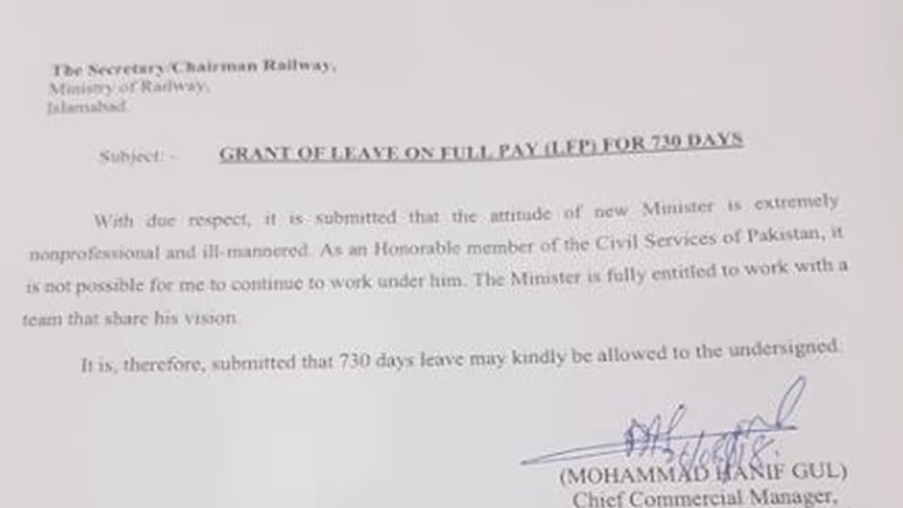 ಹೊಸ ರೈಲ್ವೆ ಸಚಿವರೊಂದಿಗೆ ಕೆಲಸ ನಿರ್ವಹಿಸಲು ಆಗದ ಕಾರಣ ರಜೆ ನೀಡಬೇಕು ಎಂದು ಕೋರಿದ್ದಾರೆ. ಹನೀಫ್ ಗುಲ್ ಎನ್ನುವ ಈ ವ್ಯಕ್ತಿ ಅನಾರೋಗ್ಯ ಹಾಗೂ ಕೆಲಸದ ಒತ್ತಡದ ಕಾರಣವನ್ನೂ ಕೂಡ ನೀಡಿದ್ದಾರೆ.