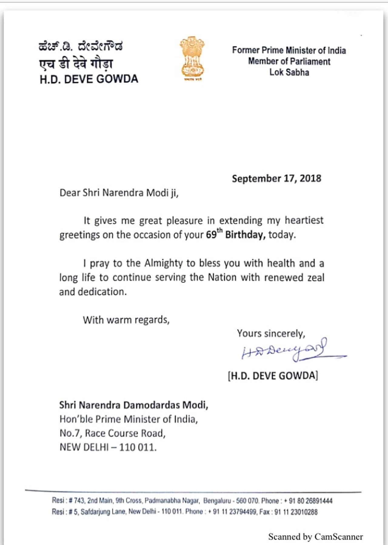 ಅದರಂತೆ ಮಾಜಿ ಪ್ರಧಾನಿ ಹೆಚ್.ಡಿ. ದೇವೇಗೌಡ ಕೂಡ ಪ್ರಧಾನಿ ಮೋದಿ ಅವರಿಗೆ ಪತ್ರ ಮುಖೇನ ಜನ್ಮದಿನದ ಶುಭಾಷಯ ತಿಳಿಸಿದ್ದು, ಉತ್ತಮ ಆರೋಗ್ಯಕ್ಕಾಗಿ ದೇವರಲ್ಲಿ ಪ್ರಾರ್ಥಿಸುವುದಾಗಿ ತಿಳಿಸಿದ್ದಾರೆ.
