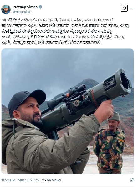 ನಾನು ಒಟ್ಟು 17 FIR ಹಾಕಿಸಿಕೊಂಡರೂ ಪರಿವಾರದ ಕಾರ್ಯ ಮುಂದುವರಿಸುತ್ತಿದ್ದೇನೆ' ಎಂದು ಬರೆದುಕೊಂಡಿದ್ದಾರೆ. ಇದಕ್ಕೆ ಪ್ರತಿಕ್ರಿಯೆ ನೀಡಿರುವ ಪ್ರತಾಪ್ ಸಿಂಹ, 'MP ಆಗಿದ್ದಾಗ FIRs ಮಾತ್ರವಲ್ಲ ಹುಣಸೂರು ಹನುಮಾನ್ ಜಯಂತಿ ಸಂಬಂಧ 2 ಕ್ರಿಮಿನಲ್ ಪ್ರಕರಣಗಳು ದಾಖಲಾಗಿದ್ದವು' ಎಂದು ಬರೆದಿದ್ದಾರೆ.