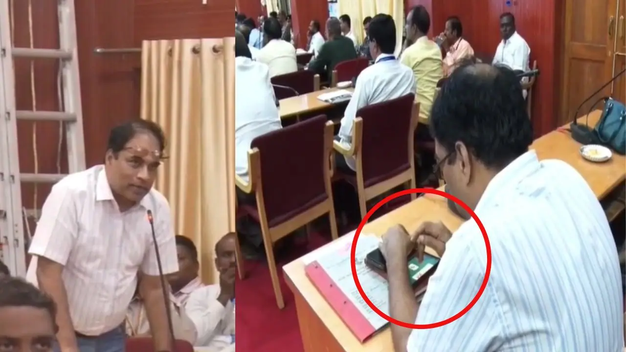 ಇಂದು ಗಂಭೀರವಾಗಿ ನಡೆಯುತ್ತಿದ್ದ ಕೆಡಿಪಿ ಸಭೆಯಲ್ಲಿ ಉಪ ಅರಣ್ಯ ಸಂರಕ್ಷಣಾಧಿಕಾರಿ ಪ್ರವೀಣ್ ಸಭೆಯ ಗಂಭೀರತೆಯ ಬಗ್ಗೆ ಕನಿಷ್ಟ ಮನಸ್ಸು ಇರಿಸಿಕೊಳ್ಳದೆ, ಮೊಬೈಲ್ನಲ್ಲಿ ರಮ್ಮಿ ಆಟವಾಡುತ್ತಿದ್ದ ದೃಶ್ಯ ವೈರಲ್ ಆಗಿದೆ. ಸಭೆಯ ವಿಷಯಗಳು ಚರ್ಚೆ ಆಗುತ್ತಿದ್ದಾಗಲೇ ಅಧಿಕಾರಿ ರಮ್ಮಿ ಆಟದಲ್ಲಿ ತೊಡಗಿಸಿಕೊಂಡಿದ್ದು, ಕ್ಯಾಮೆರಾ ಕಣ್ಣಿಗೆ ಬಿದ್ದಿದೆ. ಈ ಬಗ್ಗೆ ಕೂಡಲೇ ಏಷ್ಯಾನೆಟ್ ಸುವರ್ಣ ನ್ಯೂಸ್ನಲ್ಲಿ ಅಧಿಕಾರಿಯ ನಿರ್ಲಕ್ಷ್ಯದ ವಿಡಿಯೋವನ್ನು ಪ್ರಸಾರ ಮಾಡಲಾಯಿತು. ಈ ವಿಡಿಯೋ ತಕ್ಷಣವೇ ಸಭೆಯಲ್ಲಿ ಹಾಜರಿದ್ದ ಸಚಿವರು ಮತ್ತು ಶಾಸಕರ ಕಣ್ಣಿಗೆ ಬಿದ್ದಿದೆ.