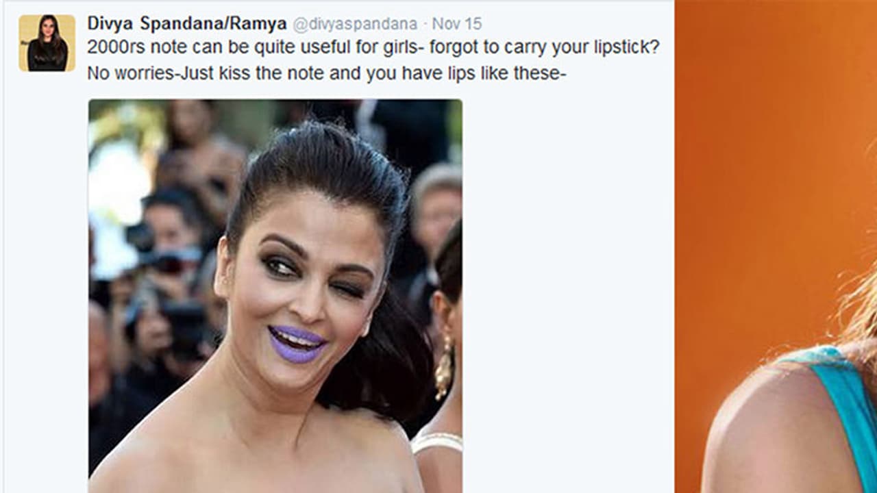 ತಮ್ಮ ಟೀಕೆಗೆ ಹೊಂದುವಂತೆ ನಟಿ ಐಶ್ವರ್ಯ ರೈ ನೇರಳೆ ಬಣ್ಣದ ಲಿಪ್ಸ್ಟಿಕ್ ಹಾಕಿರುವ ಫೋಟೋ ಅಪ್ ಲೋಡ್ ಮಾಡಿದ್ದಾರೆ. ರಮ್ಯಾ ಟ್ವೀಟ್ ಗೆ ಅನೇಕ ಪರ-ವಿರೋಧ ಪ್ರತಿಕ್ರಿಯೆಗಳು ವ್ಯಕ್ತವಾಗಿವೆ.