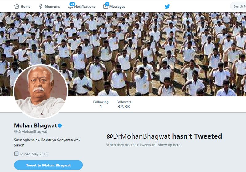 Tweet to @drmohanbhagwatಆದರೆ ಟ್ವಿಟರ್ ಖಾತೆ ತೆರೆದ ಹೊರತಾಗಿಯೂ ಈ ನಾಯಕರು, ಅದನ್ನು ಸಂಘಟನೆಯ ಮಾಹಿತಿ ಹಂಚಿಕೆ ಮಾಡಲು ಮತ್ತು ಜನರೊಂದಿಗೆ ಬೆರೆಯಲು ಬಳಸುವ ಸಾಧ್ಯತೆ ಕಡಿಮೆ. ತಮ್ಮ ಹೆಸರಲ್ಲಿ ನಕಲಿ ಖಾತೆ ತೆರೆದು ಅದನ್ನು ದುರುಪಯೋಗ ಪಡಿಸಿಕೊಳ್ಳುತ್ತಿರುವವರ ಸಂಖ್ಯೆ ಹೆಚ್ಚುತ್ತಿರುವ ಹಿನ್ನೆಲೆಯಲ್ಲಿ ಸ್ವತಃ ತಾವೇ ಖಾತೆ ಆರಂಭ ಮಾಡಲು ಈ ನಾಯಕರು ನಿರ್ಧರಿಸದ್ದಾರೆ ಎಂದು ಮೂಲಗಳು ತಿಳಿಸಿವೆ.