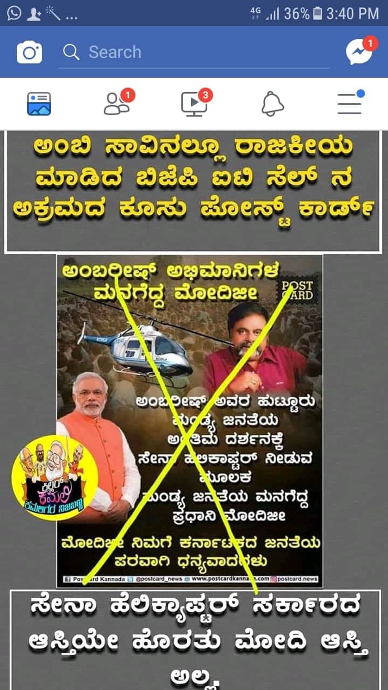 ವಿಶ್ವೇಶ್ವರಯ್ಯ ಕ್ರೀಡಾಂಗಣದಲ್ಲಿ ಮಂಡ್ಯಕ್ಕೆ ಪಾರ್ಥಿವ ಶರೀರ ತಂದ ಕೀರ್ತಿ ಸಿಎಂಗೆ ಹೋಗಬೇಕೆಂದು ಪದೇ ಪದೇ ಜೆಡಿಎಸ್ ನಾಯಕರು ಹೇಳುತ್ತಲೇ ಬಂದಿದ್ದಾರೆ. ಆದರೆ ಅಂಬಿ ಪಾರ್ಥಿವ ಶರೀರ ಮಂಡ್ಯಕ್ಕೆ ತರಲು ಮೋದಿ ಕಾರಣ ಎಂದು ಬಿಜೆಪಿ ಮುಖಂಡರ ವಾದ. ಮಂಡ್ಯಕ್ಕೆ ರಕ್ಷಣಾ ಇಲಾಖೆ ಹೆಲಿಕಾಪ್ಟರ್ ಕಳುಹಿಸಿಕೊಟ್ಟಿದ್ದು ಮೋದಿ ಎಂಬ ವಿಚಾರವನ್ನು ಬಿಜೆಪಿ ನಾಯಕರು ಸೋಶಿಯಲ್ ಮೀಡಿಯಾದಲ್ಲಿ ಹಂಚಿಕೊಂಡಿದ್ದಾರೆ.