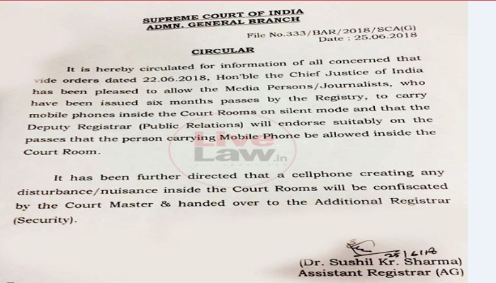 ಮಾನ್ಯ ಸುಪ್ರೀಂ ಕೋರ್ಟ್ ನ್ಯಾಯಾಧೀಶರು ಇಂದು ಹೊರಡಿಸಿರುವ ಆದೇಶದಂತೆ ಮಾಧ್ಯಮ ವ್ಯಕ್ತಿಗಳು/ಪತ್ರಕರ್ತರಿಗೆ ಮೊಬೈಲ್ ಹೊಂದಿರಲು ಅನುಮತಿ ನೀಡಲಾಗಿದೆ.ರಿಜಿಸ್ಟ್ರಾರ್ ಅವರಿಂದ 6 ತಿಂಗಳ ಪಾಸ್ ಪಡೆದುಕೊಳ್ಳುವುದು ಕಡ್ಡಾಯವಾಗಿದೆ.