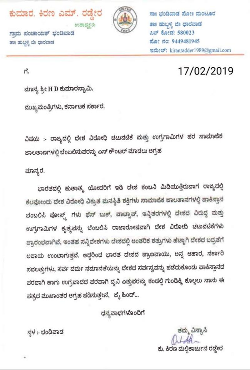 ಹುಬ್ಬಳ್ಳಿ ತಾಲೂಕಿನ ಬಂಡಿವಾದ ಗ್ರಾಮ ಪಂಚಾಯಿತಿ ಉಪಾಧ್ಯಕ್ಷ ಕಿರಣ ಕುಮಾರ ರಡ್ಡೆರ ಎಂಬುವವರೇ ಮುಖ್ಯಮಂತ್ರಿಗಳಿಗೆ ಪತ್ರ ಬರೆದವರು. ಹುತಾತ್ಮ ಯೋಧರಿಗೆ ಇಡಿ ದೇಶ ಕಂಬನಿ ಮಿಡಿಯುತ್ತಿರುವಾಗ ರಾಜ್ಯದಲ್ಲಿ ಕೆಲ ದೇಶ ವಿರೋಧಿ ಶಕ್ತಿಗಳು ಪಾಕಿಸ್ತಾನ ಹಾಗೂ ಉಗ್ರಗಾಮಿಗಳನ್ನು ಬೆಂಬಲಿಸಿ ಸಾಮಾಜಿಕ ಜಾಲತಾಣದಲ್ಲಿ ರಾಜಾರೋಷವಾಗಿ ಬರೆಯುತ್ತಿದ್ದಾರೆ. ಇದರಿಂದ ದೇಶದಲ್ಲಿ ಆಂತರಿಕ ಭದ್ರತೆಗೆ ಧಕ್ಕೆಯಾಗುತ್ತಿದೆ. ಇಂತವರನ್ನು ಮೇಲೆ ಕ್ರಮಕೈಗೊಳ್ಳಬೇಕು ಎಂದು ಆಗ್ರಹಿಸಿದ್ದಾರೆ.