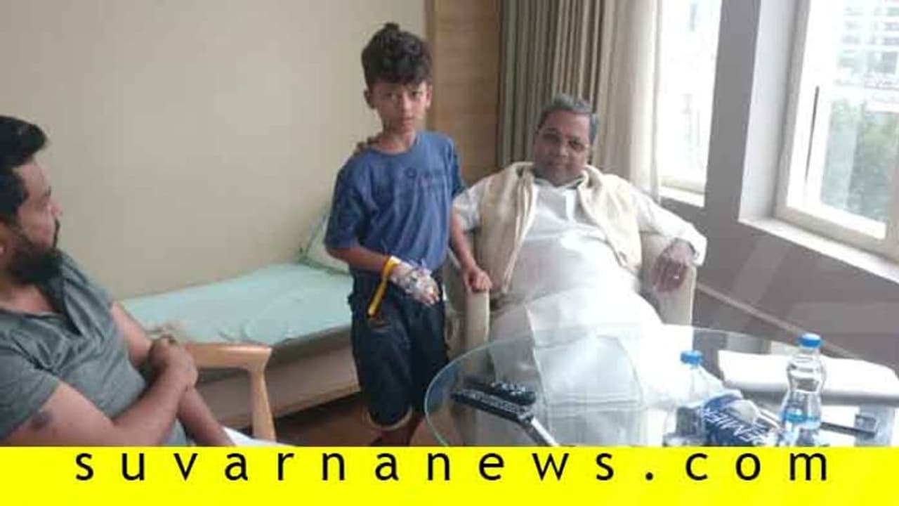 ಬೆಂಗಳೂರು[ಜು.16]: ಹೃದಯಾಘಾತದಿಂದ ಹೆಬ್ಬಾಳದ ಆಸ್ಟರ್ ಆಸ್ಪತ್ರೆಯಲ್ಲಿ ಚಿಕಿತ್ಸೆ ಪಡೆಯುತ್ತಿರುವ ಬಳ್ಳಾರಿ ಗ್ರಾಮಾಂತರ ಶಾಸಕ ಬಿ. ನಾಗೇಂದ್ರ ಭೇಟಿಯಾದ ಮಾಜಿ ಸಿಎಂ ಸಿದ್ದರಾಮಯ್ಯ ಆರೋಗ್ಯ ವಿಚಾರಿಸಿದ್ದಾರೆ. ಇದೇ ವೇಳೆ ತನ್ನ ಓರ್ವ ಪುಟ್ಟ ಅಭಿಮಾನಿಯನ್ನೂ ಮಾತನಾಡಿಸಿದ್ದಾರೆ