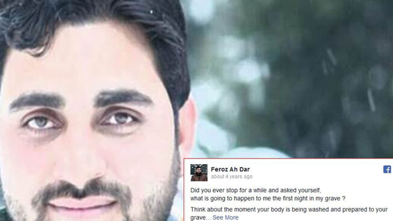 ಹುಟ್ಟಿದ ಪ್ರತಿಯೊಂದು ಜೀವಿಗೂ ಸಾವು ಖಚಿತವಾದರೂ, ಸಾವು ಯಾವ ರೂಪದಲ್ಲಿ ಬರಬಹುದೆಂಬುದನ್ನು ಯಾರೊಬ್ಬರೂ ಊಹಿಸಲಾರರು. ಆದರೆ ಕೆಲವರು ತಮ್ಮ ಸಾವಿನ ಬಗ್ಗೆ ತಾವೇ ಆಡಿಕೊಂಡ ಮಾತುಗಳು ಕೆಲವೊಮ್ಮೆ ಅವರ ಸಾವಿನ ಸಂದರ್ಭ ಆಪ್ತರಲ್ಲಿ ಸಾಕಷ್ಟುನೋವನ್ನು ತರುವುದಿದೆ. ಅಂತಹುದೇ ಒಂದು ಸನ್ನಿವೇಶ ಶುಕ್ರವಾರ ಜಮ್ಮು-ಕಾಶ್ಮೀರದಲ್ಲಿ ಉಗ್ರರೊಂದಿಗೆ ನಡೆದ ಘರ್ಷಣೆಯಲ್ಲಿ ಹುತಾತ್ಮರಾದ 32ರ ಹರೆಯದ ಪೊಲೀಸ್‌ ಅಧಿಕಾರಿ ಫಿರೋಜ್‌ ಅಹ್ಮದ್‌ ದಾರ್‌ ಅವರ ವಿಷಯದಲ್ಲಿ ಸೃಷ್ಟಿಯಾಗಿದೆ.