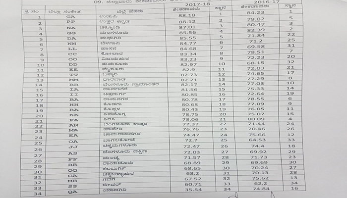 ಈ ಬಾರಿ ಉಡುಪಿ ಜಿಲ್ಲೆ ಪ್ರಥಮ ಸ್ಥಾನ ಪಡೆದುಕೊಂಡಿದ್ದು, ಉತ್ತರ ಕನ್ನಡ ದ್ವಿತೀಯ ಸ್ಥಾನವನ್ನು ಪಡೆದುಕೊಂಡಿದೆ. ತೃತೀಯ ಸ್ಥಾನವನ್ನು ಚಿಕ್ಕೋಡಿ ಪಡೆದುಕೊಂಡಿದೆ. ಯಾದಗಿರಿ ಪಟ್ಟಿಯಲ್ಲಿ ಕಡೆಯ ಸ್ಥಾನ ಪಡೆದುಕೊಂಡಿದೆ.