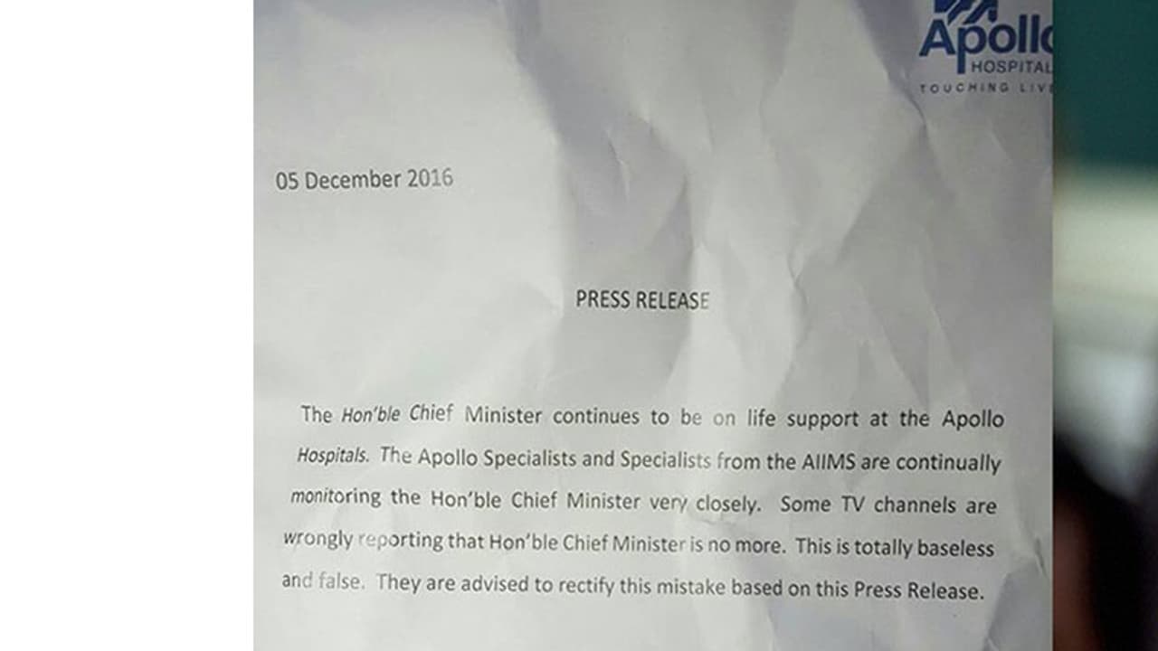ಪತ್ರಿಕಾ ಹೇಳಿಕೆ ಬಿಡುಗಡೆ ಮಾಡಿರುವ ಅಪೋಲೋ ಆಸ್ಪತ್ರೆ, ಜಯಲಲಿತಾ ಅವರಿಗೆ ಚಿಕಿತ್ಸೆ ಮುಂದುವರೆಸಿರುವುದಾಗಿ ತಿಳಿಸಿದೆ.