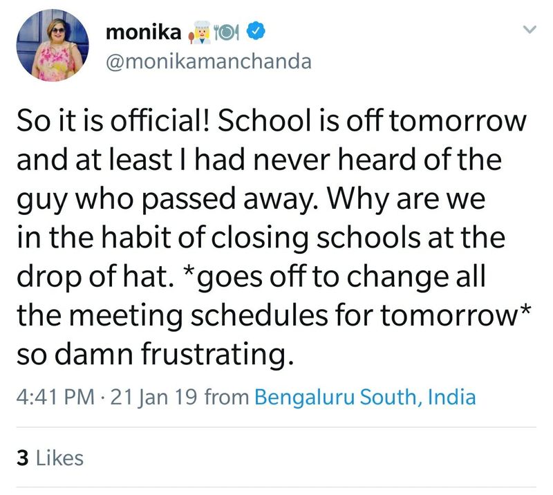 ಮೋನಿಕಾ ಹೆಸರಿನ ಮಹಿಳೆ ಬೆಂಗಳೂರಿನಿಂದಲೇ ಟ್ವೀಟ್ ಮಾಡಿದ್ದಾರೆ. ಇವರ ಹೇಳಿಕೆ ಗಮನಿಸಿದರೆ ಯಾವುದೋ ಶಾಲಾ ಆಡಳಿತ ಮಂಡಳಿಯ ಅಧ್ಯಕ್ಷೆ ಆಗಿರಬಹದು ಎಂದು ಭಾವಿಸಬಹುದು.