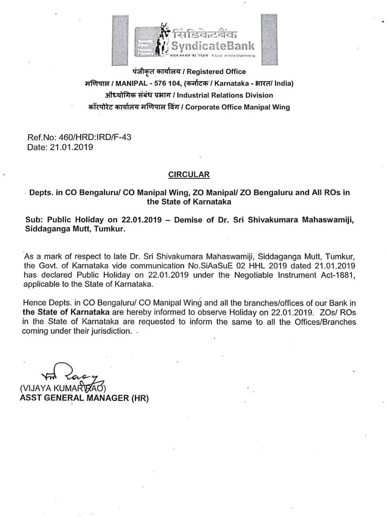 ಬೆಂಗಳೂರು[ಜ.21] ರಾಜ್ಯದಲ್ಲಿ 3 ದಿನ ಶೋಕಾಚರಣೆಗೆ ಮಾಡಲಾಗುತ್ತಿದೆ. ಮಂಗಳವಾರ ಅಂದರೆ ಜನವರಿ 22 ರಂದು ಬ್ಯಾಂಕ್ಗಳಿಗೂ ರಜಾ ಇರಲಿದೆ.