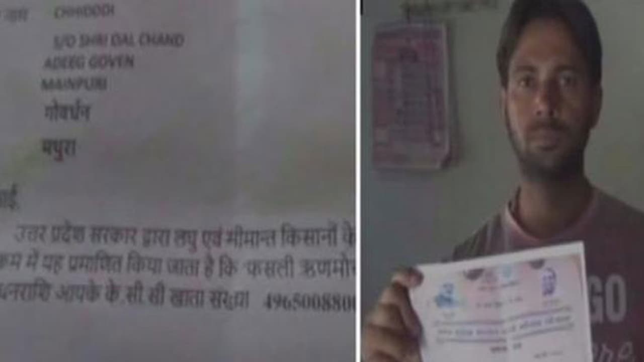 ಮಥುರಾದಲ್ಲಿ ಛಿಡ್ಡಿ ಎಂಬ ರೈತ ಪಂಜಾಬ್ ನ್ಯಾಷನಲ್ ಬ್ಯಾಂಕ್ನಲ್ಲಿ 1.50 ಲಕ್ಷ ರು. ಸಾಲ ಮಾಡಿದ್ದು, ಯೋಜನೆಯಂತೆ 1 ಲಕ್ಷ ರು. ಸಾಲ ಮನ್ನಾಕ್ಕೆ ಅರ್ಹನಾಗಿದ್ದಾನೆ. ಆದರೆ, ಸರ್ಕಾರ ಒಂದು ಲಕ್ಷದ ಬದಲು ಒಂದು ಪೈಸೆ ಸಾಲ ಮಾನ್ನಾ ಮಾಡಿರುವುದಾಗಿ ಪ್ರಮಾಣಪತ್ರ ನೀಡಿದೆ.