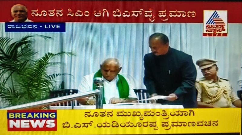 ಕರ್ನಾಟಕದಲ್ಲಿ ಮತ್ತೆ ಅರಳಿದ ಕಮಲ/ 22ನೇ ಸಿಎಂ ಆಗಿ ಬಿ.ಎಸ್.ಯಡಿಯೂರಪ್ಪ ಪ್ರಮಾಣ ವಚನ/ ಹಸಿರು ಶಾಲು ಹೊದ್ದು ಪ್ರಮಾಣ ವಚನ ತೆಗೆದುಕೊಂಡ ಬಿಎಸ್ ವೈ/ 4 ನೇ ಸಾರಿ ಮುಖ್ಯಮಂತ್ರಿಯಾಗಿ ಅಧಿಕಾರ ಸ್ವೀಕಾರ