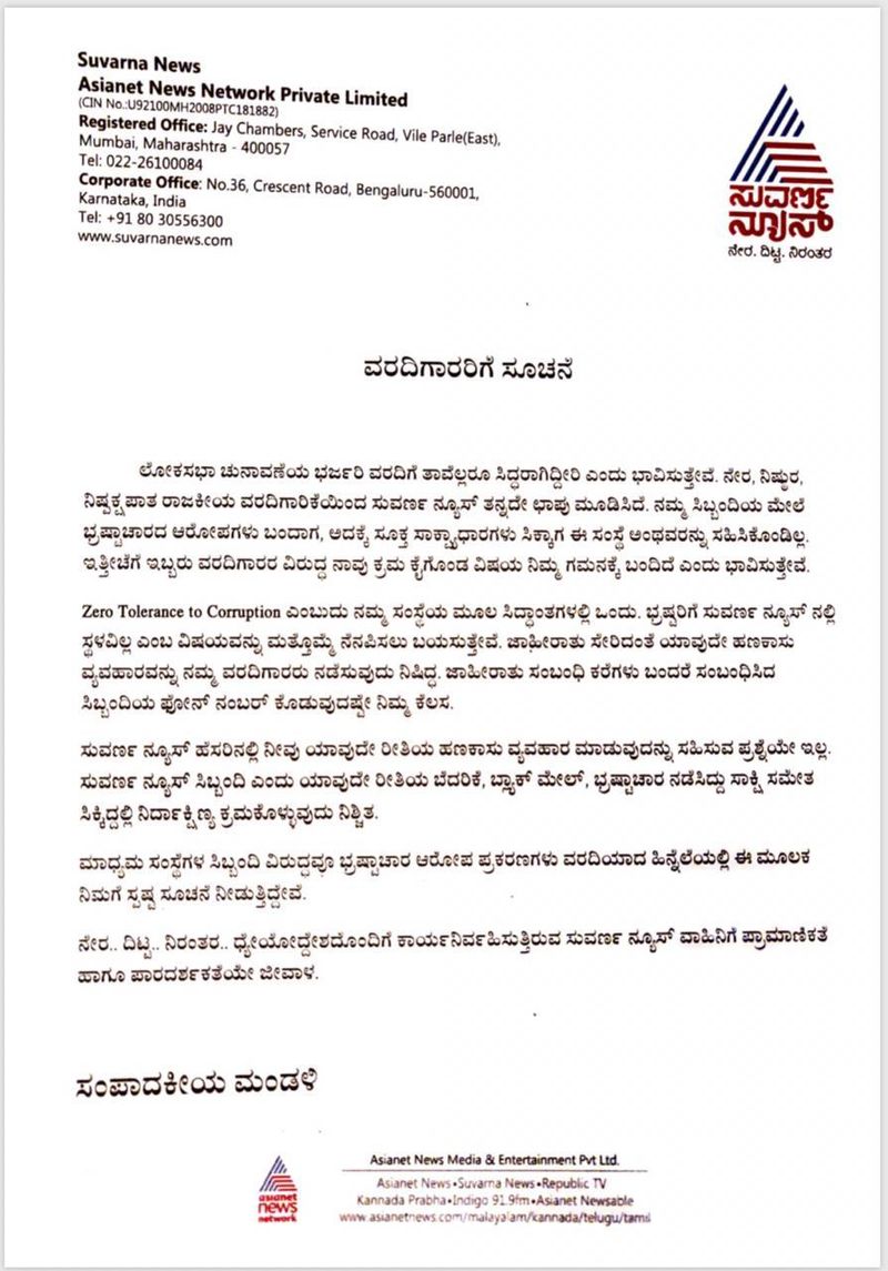 ಬ್ಲ್ಯಾಕ್ಮೇಲ್, ಭ್ರಷ್ಟಾಚಾರವನ್ನು ಸುವರ್ಣ ನ್ಯೂಸ್ ಎಂದಿಗೂ ಸಹಿಸುವುದಿಲ್ಲ ಹಾಗೂ ಇಂತಹ ಪ್ರಕರಣದಲ್ಲಿ ಭಾಗಿಯಾದವರನ್ನು ರಕ್ಷಿಸುವುದಿಲ್ಲ . ಪ್ರಕರಣದಲ್ಲಿ ಪೊಲೀಸ್ ಇಲಾಖೆ ಕಠಿಣ ಕಾನೂನು ಕ್ರಮ ಕೈಗೊಳ್ಳಬೇಕು. ವಾಹಿನಿಯ ಎಲ್ಲ ವರದಿಗಾರರಿಗೂ ಈಗಾಗಲೇ ಎಚ್ಚರಿಕೆ ನೀಡಿದೆ ಹಾಗೂ ಇಂತಹ ಅಕ್ರಮಗಳಲ್ಲಿ ಭಾಗಿಯಾಗಿರುವುದು ಸಾರ್ವಜನಿಕರ ಗಮನಕ್ಕೆ ಬಂದರೆ ಸುವರ್ಣ ನ್ಯೂಸ್ ಕಚೇರಿ ಅಥವಾ ಪೊಲೀಸರಿಗೆ ಮಾಹಿತಿ ನೀಡಬಹುದು.