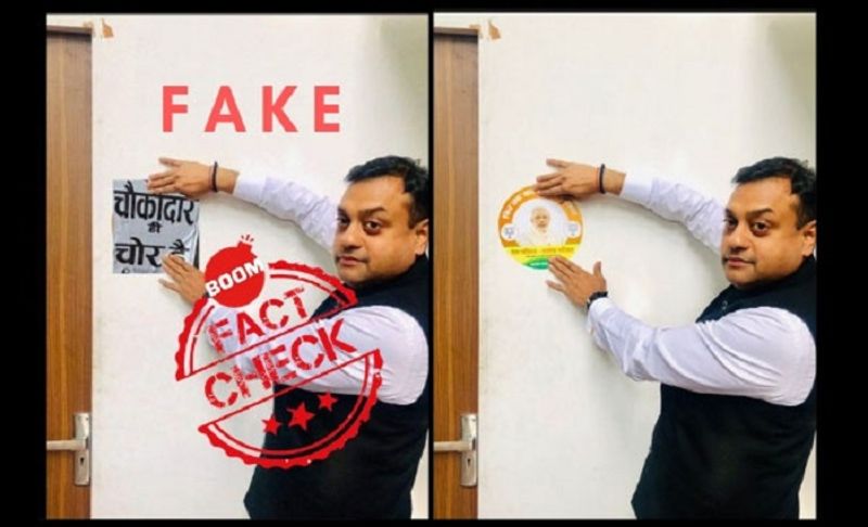 ಬಿಜೆಪಿ ವಕ್ತಾರ ಸಂಬೀತ್ ಪಾತ್ರಾ ‘ಚೌಕಿದಾರ್ ಹೀ ಚೋರ್ ಹೈ’ ಎಂದು ಬರೆದ ಸ್ಟಿಕ್ಕರ್ ಅನ್ನು ಗೋಡೆಗೆ ಅಂಟಿಸುತ್ತಿರುವ ಫೋಟೋ ಸಾಮಾಜಿಕ ಜಾಲತಾಣಗಳಲ್ಲಿ ವೈರಲ್ ಆಗಿದೆ.