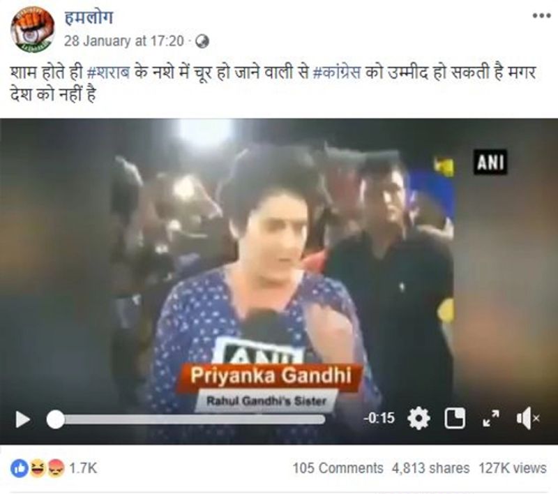 ಕಾಂಗ್ರೆಸ್ ಜನರಲ್ ಸೆಕ್ರೆಟರಿಯಾಗಿ ನೇಮಕವಾಗಿರುವ ಪ್ರಿಯಾಂಕಾ ಗಾಂಧಿ ಕುಡಿದ ಮತ್ತಿನಲ್ಲಿದ್ದಾರೆ ಎನ್ನಲಾದ ವಿಡಿಯೋವೊಂದು ಸಾಮಾಜಿಕ ಜಾಲತಾಣಗಳಲ್ಲಿ ವೈರಲ್ ಆಗಿದೆ. ಹಮ್ಲೋಗ್ ಎಂಬ ಫೇಸ್ಬುಕ್ ಪೇಜ್ ಈ ವಿಡಿಯೋವನ್ನು ಪೋಸ್ಟ್ ಮಾಡಿ, ‘ಕುಡಿದ ನಾಯಕರ ಮೇಲೆ ಕಾಂಗ್ರೆಸ್ ನಂಬಿಕೆ, ನಿರೀಕ್ಷೆ ಇಡಬಹುದು. ಆದರೆ ದೇಶದ ಜನರು ನಂಬಿಕೆ ಇಡಲು ಸಾಧ್ಯವಿಲ್ಲ’ ಎಂದು ಬರೆದಿದೆ.