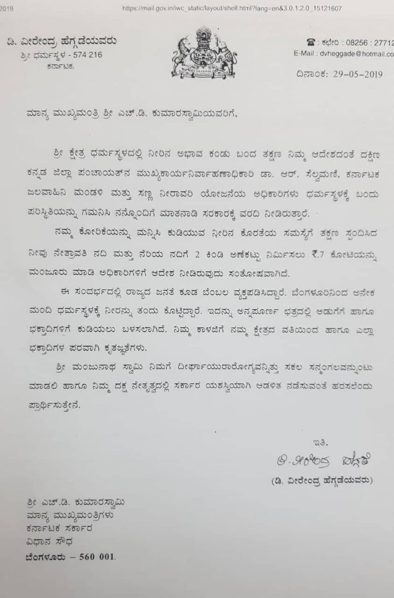 ಧರ್ಮಸ್ಥಳ[ಮೇ. 29] ಸಿಎಂ ಕುಮಾರಸ್ವಾಮಿ ಗೆ ಧರ್ಮಸ್ಥಳ ಧರ್ಮಾಧಿಕಾರಿ ವೀರೇಂದ್ರ ಹೆಗ್ಗಡೆ ಪತ್ರ ಬರೆದು ಧನ್ಯವಾದ ತಿಳಿಸಿದ್ದಾರೆ. ಧರ್ಮಸ್ಥಳದಲ್ಲಿ ನೀರಿ ಅಭಾವಕ್ಕೆ ಸರ್ಕಾರ ಸ್ಪಂದಿಸದಕ್ಕೆ ಸಿಎಂ ಕುಮಾರಸ್ವಾಮಿಗೆ ಹೆಗ್ಗಡೆ ಕ್ರತಜ್ಞತೆ ಸಲ್ಲಿಸಿದ್ದಾರೆ.