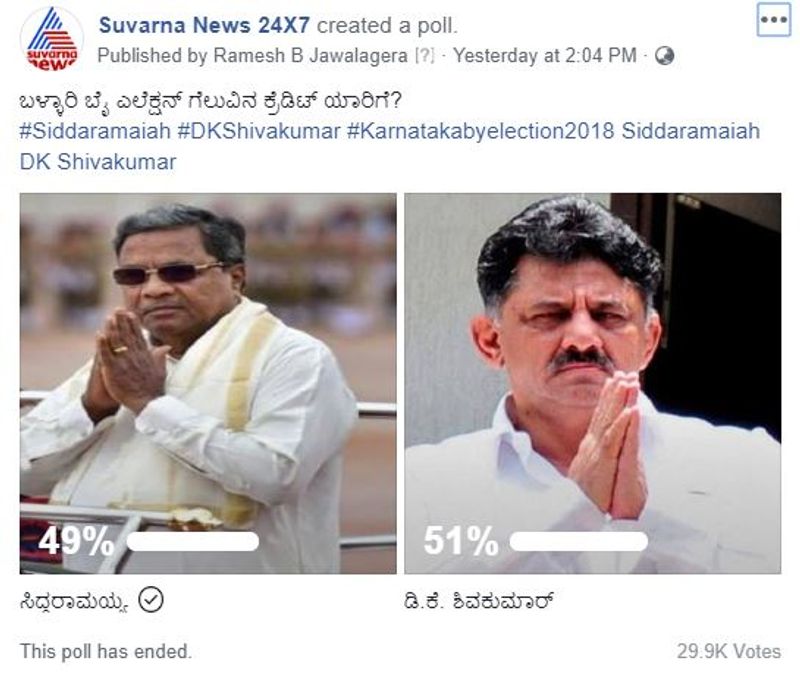 ಈ ಹಿನ್ನಲೆಯಲ್ಲಿ ಈ ಬಗ್ಗೆ ನಿಮ್ಮ ಸುವರ್ಣ ನ್ಯೂಸ್ ಫೇಸ್ಬುಕ್ನಲ್ಲಿ ‘ಬಳ್ಳಾರಿ ಗೆಲುವಿನ ಕ್ರೆಡಿಟ್ ಯಾರಿಗೆ?’ ಎಂದು ಒಂದು ಪೋಲ್ ಹಾಕಿದ್ದು, ನಿಮ್ಮ ಮತ ಯಾರಿಗೆ ಎಂದು ಕೇಳಿತ್ತು. ಈ ಒಂದು ಪೋಲಿಂಗ್ನಲ್ಲಿ ಸರಿಸುಮಾರು 30 ಸಾವಿರ ಓದುಗರು ವೋಟಿಂಗ್ ಮಾಡಿದ್ದು, 14 ಸಾವಿರ ಜನರರು ಸಿದ್ದರಾಮಯ್ಯ ಪರ ವೋಟ್ ಮಾಡಿದ್ರೆ, 15 ಸಾವಿರ ಜನರು ಬಳ್ಳಾರಿ ಗೆಲುವಿನ ಕ್ರೆಡಿಟ್ ಡಿ.ಕೆ.ಶಿವಕುಮಾರ್ಗೆ ಎಂದು ವೋಟ್ ಮಾಡಿದ್ದಾರೆ.