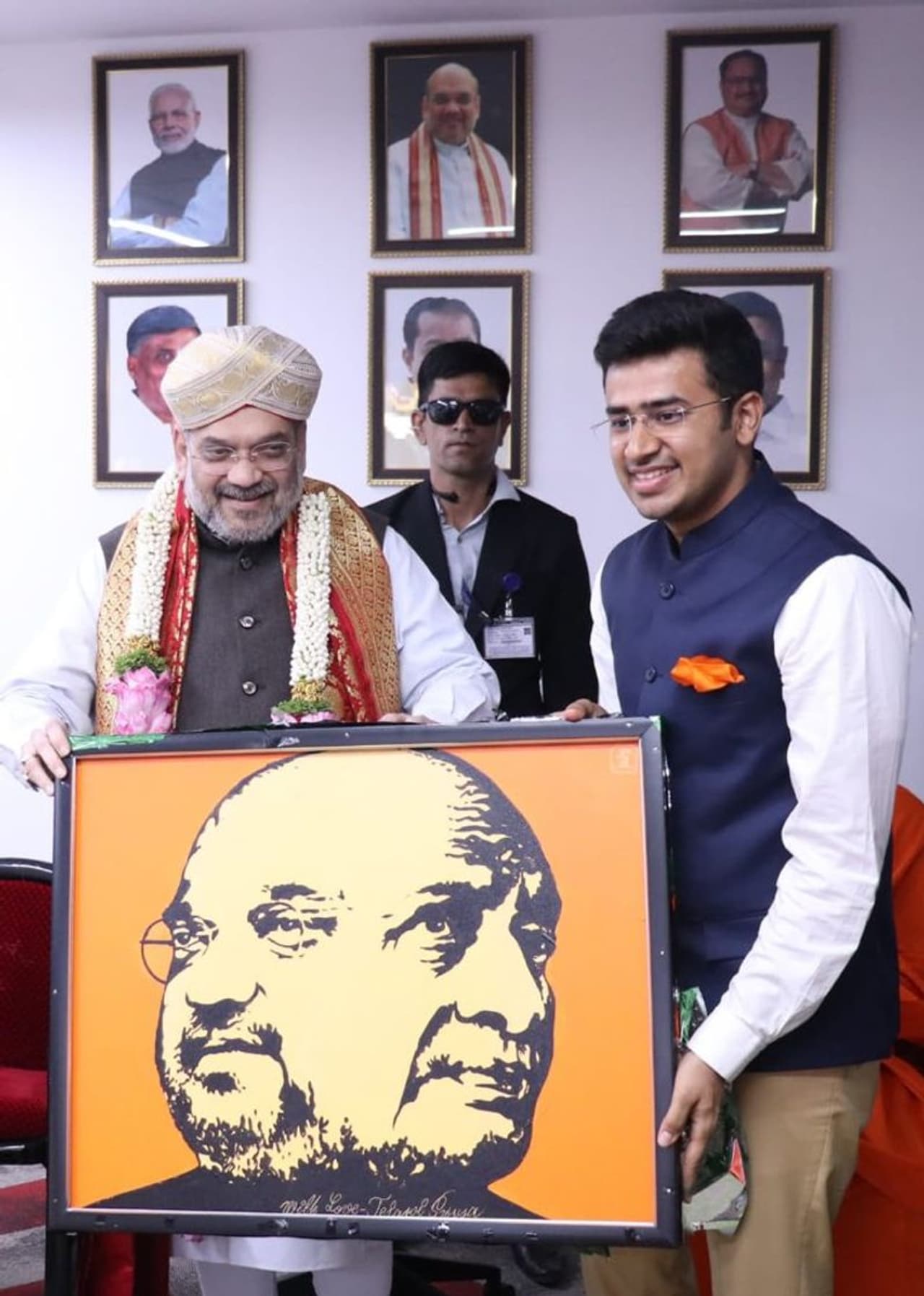 ಸರ್ದಾರ್ ವಲ್ಲಭಭಾಯ್ ಪಟೇಲ್ ಅವರ ಮುಖದ ಅಮಿತ್ ಶಾ ಅವರ ಮುಖ ಇರುವ ಪೇಟಿಂಗ್ ಫ್ರೇಮ್ ಗಿಫ್ಟ್ ನೀಡಿದರು. ಅದನ್ನು ಸ್ವತಃ ತೇಜಸ್ವಿ ಸೂರ್ಯ ಅವರು ಟ್ವಿಟ್ಟರ್ನಲ್ಲಿ ಹಂಚಿಕೊಂಡಿದ್ದಾರೆ.