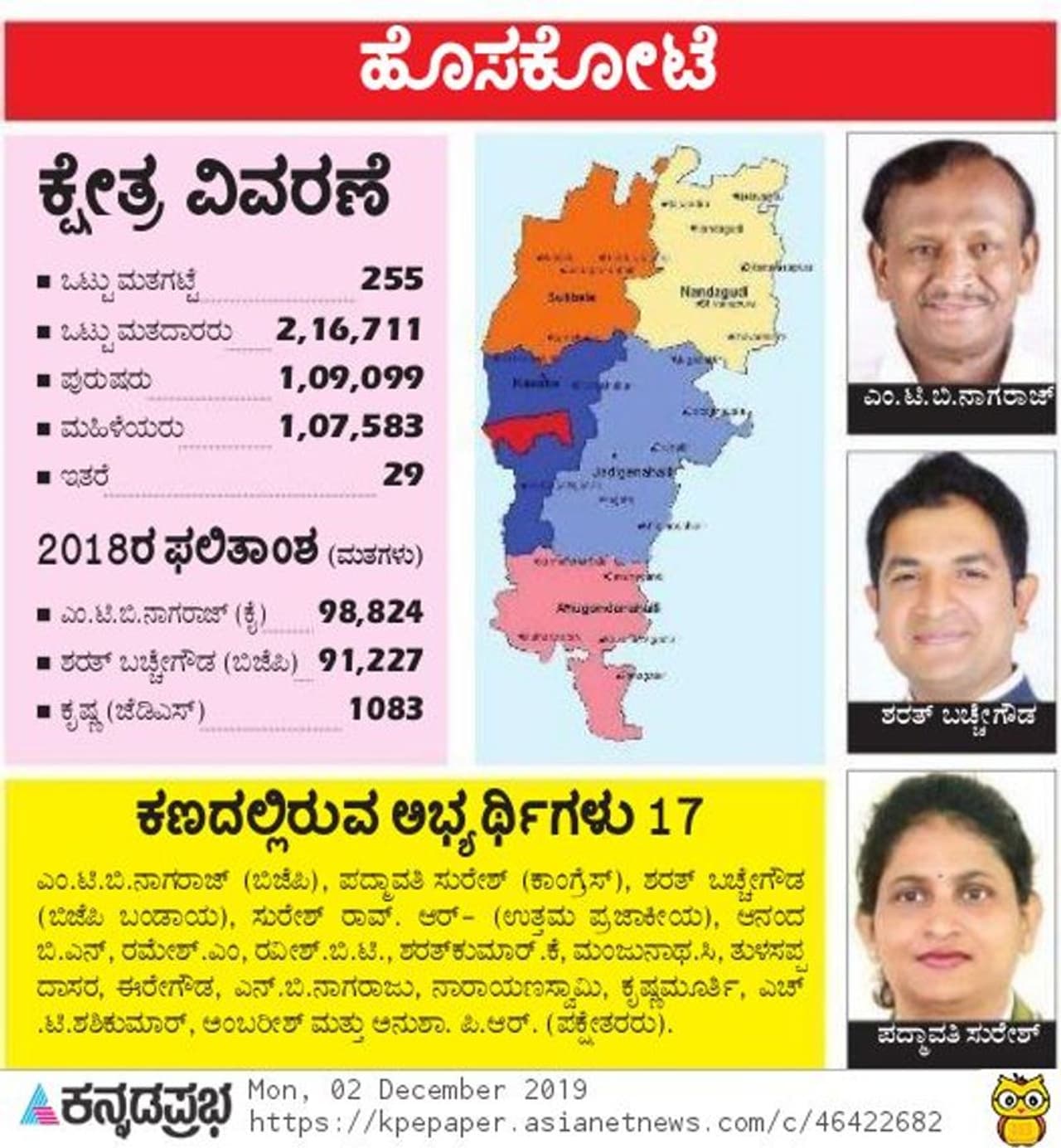 ಬೆಂಗಳೂರು (ಡಿ. 02): ಪ್ರಸಕ್ತ ಉಪಚುನಾವಣೆ ನಡೆಯುತ್ತಿರುವ ರಾಜ್ಯದ 15 ವಿಧಾನಸಭಾ ಕ್ಷೇತ್ರಗಳ ಪೈಕಿ ತೀವ್ರ ಕುತೂಹಲ ಕೆರಳಿಸಿರುವ ಮತ್ತು ಜಿದ್ದಾಜಿದ್ದಿನ ಕ್ಷೇತ್ರ ಹೊಸಕೋಟೆ. ಇಲ್ಲಿ ಯಾರೇ ಗೆದ್ದರೂ ಮತಗಳ ಅಂತರ ಮಾತ್ರ ತೀರಾ ಕಡಿಮೆ.