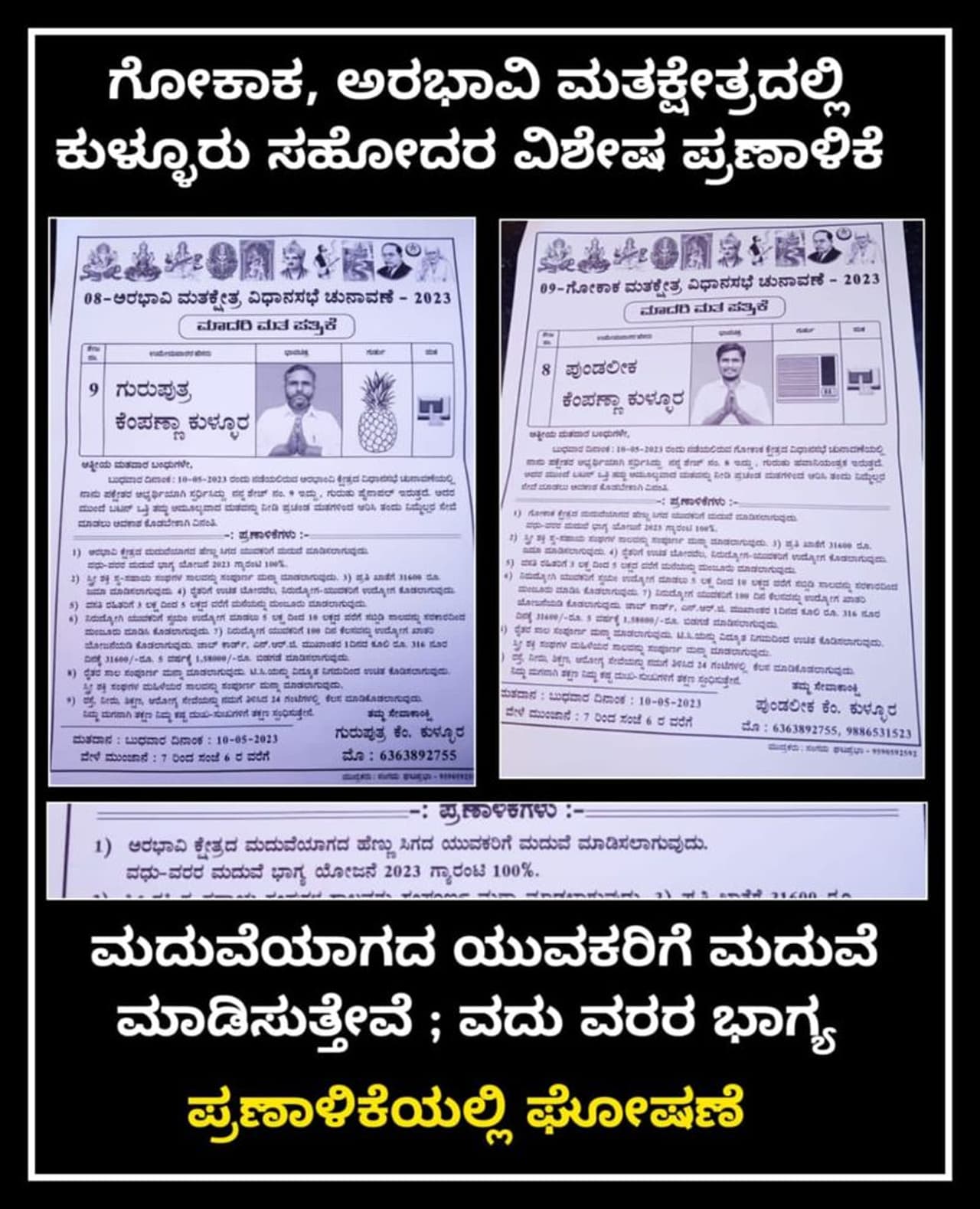 ಗುರುಪುತ್ರ ಕುಳ್ಳೂರ ಹಾಗೂ ಪುಂಡಲೀಕ ಕುಳ್ಳೂರ ಇಬ್ಬರೂ ಸಹೋದರರಾಗಿದ್ದು, ಮದುವೆಯಾಗದ ಯುವಕರಿಗೆ ಮದುವೆ ಮಾಡಿಸುವುದಾಗಿ ಪ್ರಣಾಳಿಕೆಯಲ್ಲಿ ಘೋಷಣೆ ಮಾಡಿದ್ದಾರೆ. ಪಕ್ಷೇತರರಾಗಿ ಅರಭಾವಿ ಹಾಗೂ ಗೋಕಾಕ ವಿಧಾನಸಭಾ ಕ್ಷೇತ್ರಗಳಿಂದ ಈ ಸಹೋದರರು ಸ್ಪರ್ಧೆಗೆ ಇಳಿದಿದ್ದಾರೆ ಎಂದು ತಿಳಿದುಬಂದಿದೆ. ಈ ಇಬ್ಬರೂ ಅಭ್ಯರ್ಥಿಗಳು ಎರಡೂ ಮತಕ್ಷೇತ್ರದ ಮದುವೆಯಾಗದ ಯುವಕರಿಗೆ ಮದುವೆ ಮಾಡಿಸುವ ಭರವಸೆಯನ್ನು ಪ್ರಣಾಳಿಕೆಯ ಮೂಲಕ ನೀಡಿದ್ದಾರೆ.