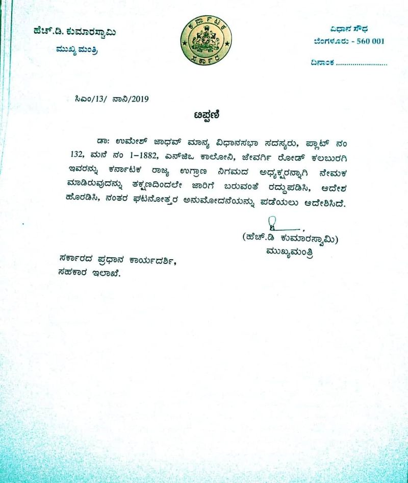 ಬೆಂಗಳೂರು[ಫೆ.07] ಉಗ್ರಾಣ ನಿಗಮದ ಅಧ್ಯಕ್ಷರಾಗಿ ನೇಮಕವಾಗಿದ್ದ ಉಮೇಶ್ ಜಾಧವ್ ಅವರಿಗೆ ನೀಡಿದ್ದ ಹುದ್ದೆಯನ್ನು ತಕ್ಷಣದಿಂದಲೇ ಜಾರಿಗೆ ಬರುವಂತೆ ರದ್ದು ಮಾಡಲಾಗಿದೆ. ಚಿಂಚೊಳ್ಳಿ ಶಾಸಕ ಉಮೇಶ್ ಜಾಧವ್ ಅವರ ಹುದ್ದೆಯನ್ನು ಮಸ್ಕಿ ಶಾಸಕ ಪ್ರತಾಪ್ ಗೌಡ ಪಾಟೀಲರಿಗೆ ನೀಡಿ ಸಿಎಂ ಕುಮಾರಸ್ವಾಮಿ ಆದೇಶ ನೀಡಿದ್ದಾರೆ.