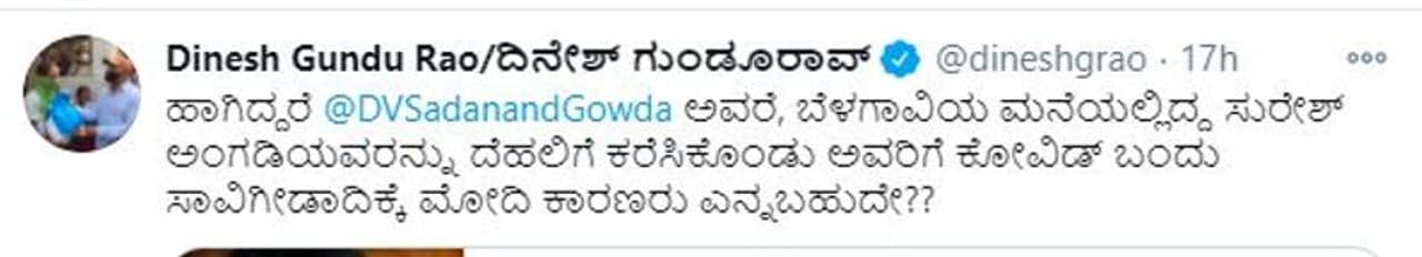 ಕೊರೋನಾ ಸೋಂಕಿನಿಂದ ದೆಹಲಿಯಲ್ಲಿ ಮೃತಪಟ್ಟ ಕೇಂದ್ರ ಸಚಿವ ಸುರೇಶ್ ಅಂಗಡಿ ಅವರ ಸಾವಿನ ಕುರಿತು ಮಾಜಿ ಸಚಿವ ದಿನೇಶ್ ಗುಂಡೂರಾವ್ ಸ್ಪೋಟಕ ಆರೋಪ ಮಾಡಿದ್ದಾರೆ.