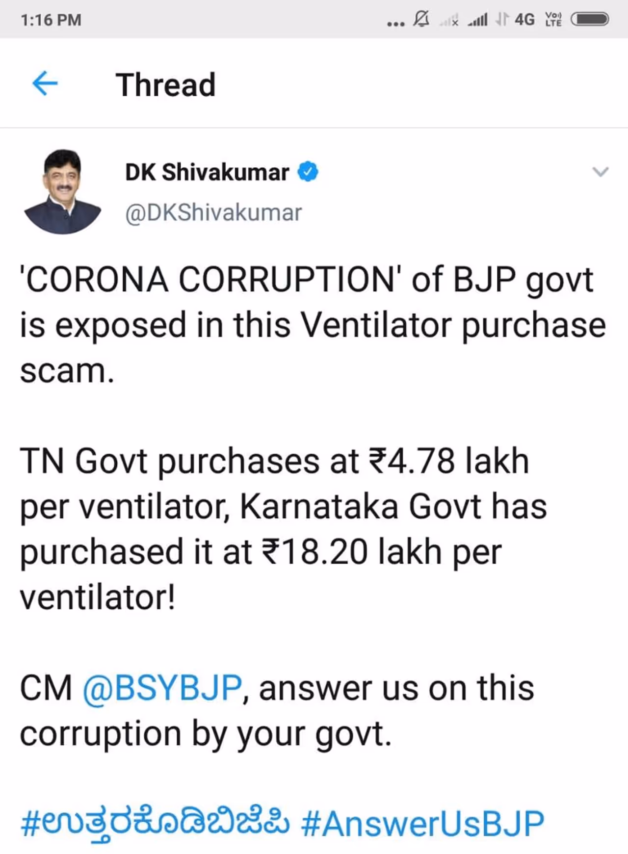 ವೆಂಟಿಲೇಟರ್ ಖರೀದಿಯಲ್ಲಿ ಬಿಜೆಪಿ ಸರಕಾರದ ಬ್ರಹ್ಮಾಂಡ ಭ್ರಷ್ಟಾಚಾರ ಇಲ್ಲಿ ಜಗಜ್ಜಾಹಿರಾಗಿದೆ , ಈ ಬಗ್ಗೆ ಸಿಎಂ ಬಿಎಸ್ ಯಡಿಯೂರಪ್ಪ ಉತ್ತರ ನೀಡಬೇಕು ಎಂದು ಕೆಪಿಸಿಸಿ ಅಧ್ಯಕ್ಷ ಡಿ.ಕೆ ಶಿವಕುಮಾರ್ ಟ್ವಿಟ್ಟರ್ ನಲ್ಲಿ ಆಗ್ರಹಿಸಿದ್ದಾರೆ.