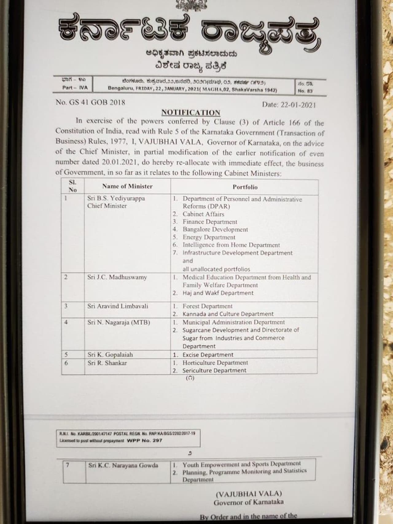 ರಾಜ್ಯ ಸಚಿವ ಸಂಪುಟದಲ್ಲಿ ಹಂಚಿಕೆಯಾದ ಕೆಲವು ಖಾತೆಗಳನ್ನ ಮರುಹಂಚಿಕೆ ಮಾಡಿ ಗುರುವಾರ ಸರ್ಕಾರ ಆದೇಶ ಹೊರಡಿಸಿತ್ತು. ಆದ್ರೆ, ಹಂಚಿಕೆಯಾದ ಖಾತೆಯಲ್ಲಿ ಮರು ಹಂಚಿಕೆ ಮಾಡಲಾಗಿದ್ದು, ಕೆಲ ಸಚಿವರ ಖಾತೆಗಳು ಹೀಗಿವೆ