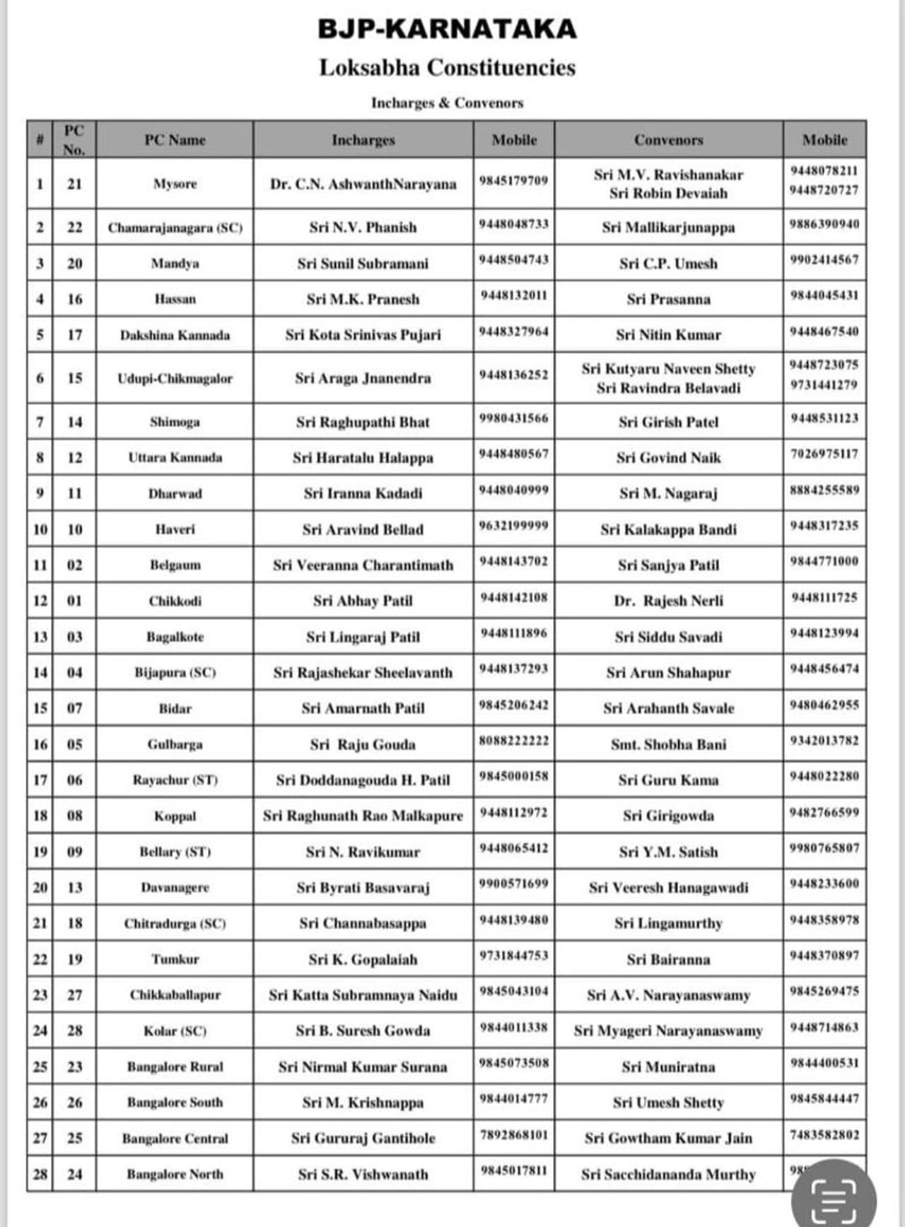 ಲೋಕಸಭಾ ಕ್ಷೇತ್ರ- ಉಸ್ತುವಾರಿಗಳು- ಸಂಚಾಲಕರು