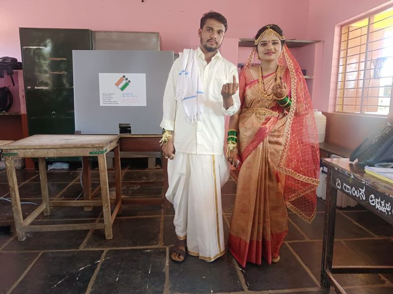 ನವದಂಪತಿಯಿಂದ ಮತದಾನ: ವಿಜಾಪುರದ ಮತಗಟ್ಟೆ ಸಂಖ್ಯೆ 13ರಲ್ಲಿ ನವ ದಂಪತಿ ಮತದಾನ. ಚಿತ್ರದುರ್ಗ ತಾಲೂಕಿನ ವಿಜಾಪುರ ಗ್ರಾಮದಲ್ಲಿ ಮತದಾನ .ಮಾಂಗಲ್ಯ ಧಾರಣೆ ಬಳಿಕ ಮತಗಟ್ಟೆಗೆ ಆಗಮಿಸಿ ಮತ ಚಲಾವಣೆ. ವಿಜಾಪುರದ ಅರುಣ್-ಕಾವ್ಯ ಮತಚಲಾಯಿಸಿದ ನವದಂಪತಿ