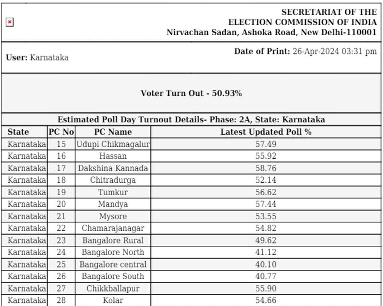 ಚುನಾವಣಾ ಆಯೋಗ ನೀಡಿರುವ ಮಾಹಿತಿ ಪ್ರಕಾರ, ಕರ್ನಾಟಕದಲ್ಲಿ ಮಧ್ಯಾಹ್ನ 3 ಗಂಟೆಯ ವೇಳೆಗೆ ಶೇ. 50.93ರಷ್ಟು ಮತದಾನವಾಗಿದೆ.