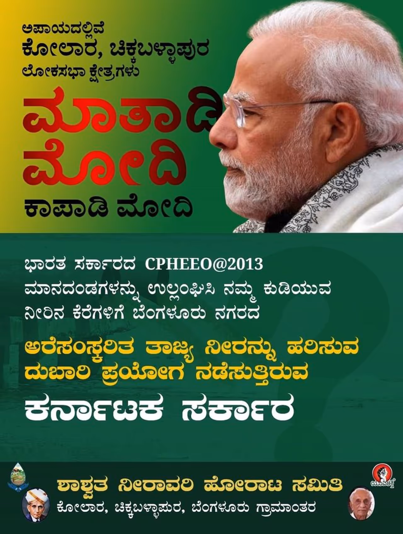 ಕೇಂದ್ರ ಸರ್ಕಾರದ 2013ರ ಮಾನದಂಡಗಳನ್ನು ಉಲ್ಲಂಘಿಸಿ ನಮ್ಮ ಕುಡಿಯುವ ನೀರಿನ ಕೆರೆಗಳಿಗೆ ಬೆಂಗಳೂರು ನಗರದ ಅರೆಸಂಸ್ಕರಿಸಿದ ತ್ಯಾಜ್ಯ ನೀರನ್ನು ಹರಿಸುವ ದುಬಾರಿ ಪ್ರಯೋಗ ನಡೆಸುತ್ತಿರುವ ಕರ್ನಾಟಕ ಸರ್ಕಾರ ಎಂದು ಪೋಸ್ಟರ್ನಲ್ಲಿ ಬಿಂಬಿಸಲಾಗಿದೆ. ಚಿಕ್ಕಬಳ್ಳಾಪುರ, ಬೆಂಗಳೂರು ಗ್ರಾಮಾಂತರ ಹಾಗೂ ಕೋಲಾರ ಜಿಲ್ಲಾ ಶಾಶ್ವತ ನೀರಾವರಿ ಹೋರಾಟ ಸಮಿತಿಯು ಜಿಲ್ಲೆಗೆ ಶಾಶ್ವತವಾದ ಸಮಗ್ರ ಹಾಗೂ ಶುದ್ದ ನೀರಾವರಿ ಯೋಜನೆಗಳನ್ನು ಅನುಷ್ಠಾನಗೊಳಿಸಬೇಕು ಎಂದಿದೆ.