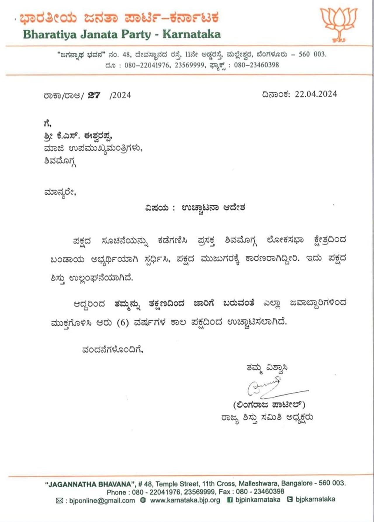 ರಾಜ್ಯ ಬಿಜೆಪಿಯ ಹಿರಿಯ ನಾಯಕ ಕೆಎಸ್ ಈಶ್ವರಪ್ಪ ಅವರನ್ನು ಬಿಜೆಪಿಯಿಂದ ಉಚ್ಚಾಟನೆ ಮಾಡಲಾಗಿದೆ. ರಾಜ್ಯ ಬಿಜೆಪಿ ಶಿಸ್ತು ಸಮಿತಿ ಈ ನಿರ್ಧಾರ ಕೈಗೊಂಡಿದೆ.