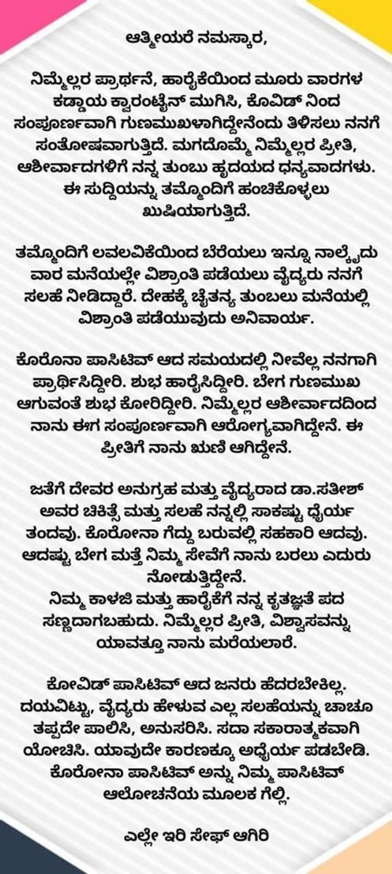 ದೇಹಕ್ಕೆ ಚೈತನ್ಯ ತುಂಬಲು ವಿಶ್ರಾಂತಿ ಅಗತ್ಯವಿದೆ ಎಂದು ವೈದ್ಯರು ಹೇಳಿದ್ದಾರೆ. ನನ್ನ ಆರೋಗ್ಯಕ್ಕಾಗಿ ನೀವೆಲ್ಲ ಪ್ರಾರ್ಥಿಸಿದ್ದೀರಿ. ಶೀಘ್ರವೇ ಗುಣಮುಖರಾಗಿ ಎಂದು ಶುಭ ಹಾರೈಸಿದ್ದೀರಿ. ದೇವರ ಅನುಗ್ರಹದ ಜತೆಗೆ ವೈದ್ಯರಾದ ಡಾ. ಸತೀಶ್ ಅವರು ನೀಡಿದ ಚಿಕಿತ್ಸೆ ಮತ್ತು ಸಲಹೆ ನನ್ನಲ್ಲಿ ಸಾಕಷ್ಟು ಧೈರ್ಯ ತುಂಬಿದೆ. ಕೊರೋನಾ ಗೆದ್ದು ಬರಲು ಸಹಾರಿಯಾದವು ಎಂದು ಸುಮಲತಾ ಫೇಸ್ಬುಕ್ ಮತ್ತು ಟ್ವಿಟ್ಟರ್ನಲ್ಲಿ ಪೋಸ್ಟ್ ಹಾಕಿಕೊಂಡಿದ್ದಾರೆ.