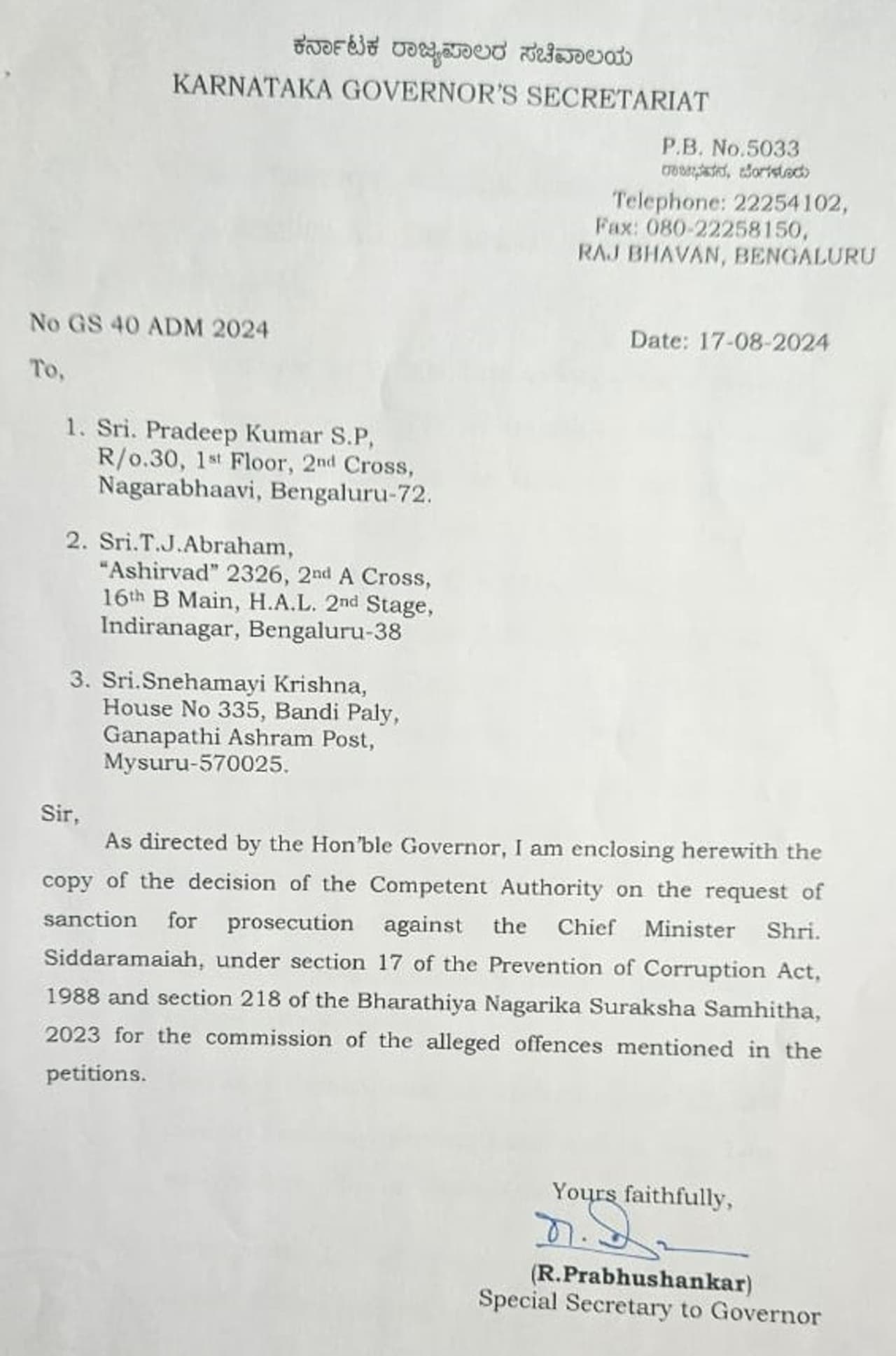 Muda Scam prosecution ಮುಡಾ ಹಗರಣದಲ್ಲಿ ರಾಜ್ಯಪಾಲ ಥಾವರ್ಚಂದ್ ಗೆಹಲೋತ್ ಅವರು ಪ್ರಾಸಿಕ್ಯೂಷನ್ಗೆ ಅನುಮತಿ ನೀಡಿದ್ದಾರೆ.